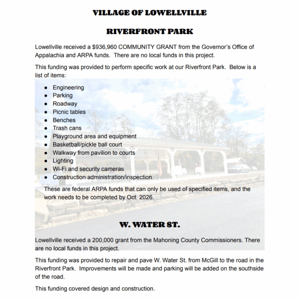Riverfront Park – currently a pavilion is being built, a parking lot, and sidewalk going to the park restrooms. This is in a location close to the canoe launch with a beautiful view of the River. This project is being funded by the Mahoning County Community Improvement Council, the Youngstown Foundation, and the Village of Lowellville. This is just the beginning, stay turned for more.